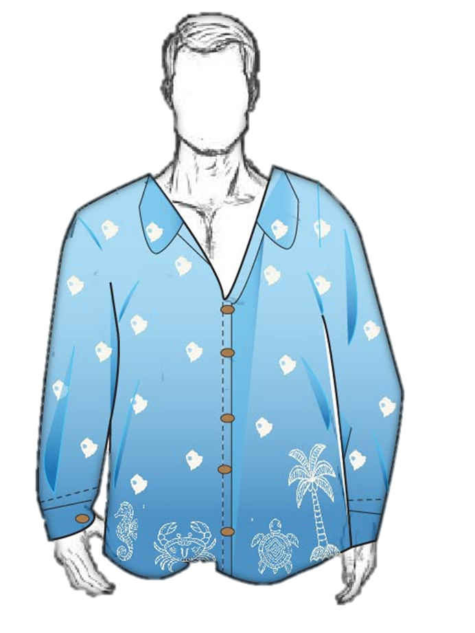 Inspired by the Bomkai sari of Odisha, this relaxed-fit men’s shirt features extra warp shell motifs over an indigo-dyed with a serene ombré wave effect. Madhubani-inspired coastal icons are hand-painted along the hem, cuffs, and sleeves.