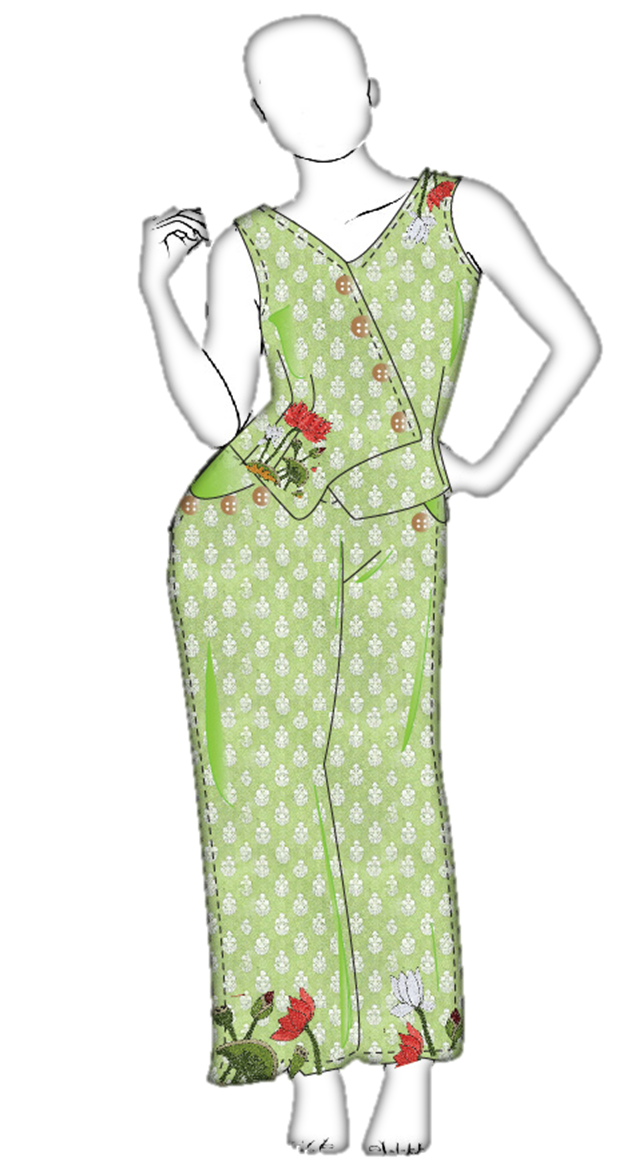 This co-set fuses Bihar’s Sujani embroidery and Rajasthan’s Dabu print. Lotus motifs, hand-stitched by rural women, bloom over naturally dyed, mud-resist printed fabric. With minimalist silhouettes and heritage craft, it reimagines tradition as breathable, everyday workwear.